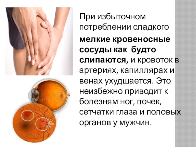 При избыточном потреблении сладкого мелкие кровеносные сосуды как будто слипаются, и кровоток в артериях, капиллярах и венах ухудшается. Это