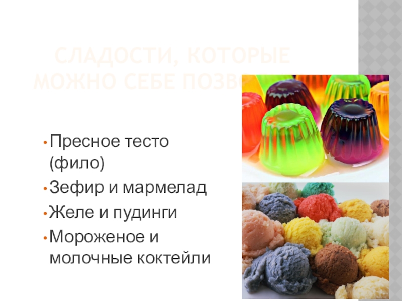 СЛАДОСТИ, КОТОРЫЕ МОЖНО СЕБЕ ПОЗВОЛИТЬПресное тесто (фило)Зефир и мармеладЖеле и пудингиМороженое и молочные коктейли