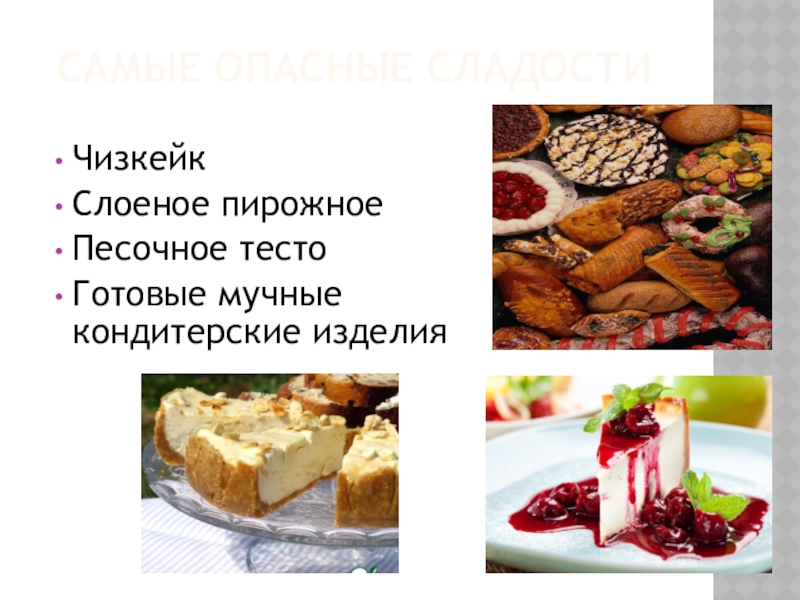 САМЫЕ ОПАСНЫЕ СЛАДОСТИЧизкейкСлоеное пирожноеПесочное тестоГотовые мучные кондитерские изделия