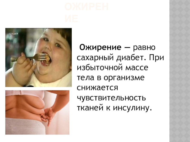ОЖИРЕНИЕ Ожирение — равно сахарный диабет. При избыточной массе тела в организме снижается чувствительность тканей к инсулину.