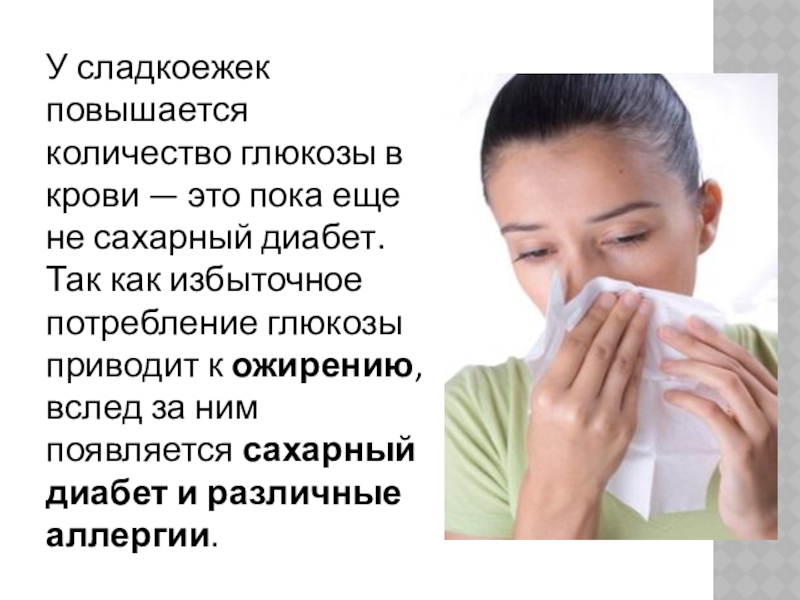 Слайд 8У сладкоежек повышается количество глюкозы в крови — это пока еще