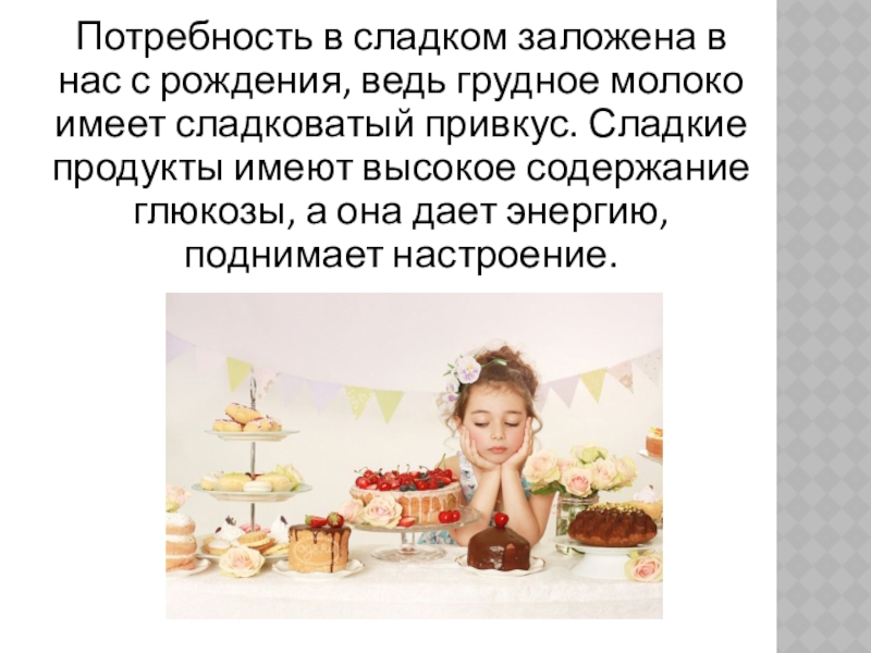 Слайд 2Потребность в сладком заложена в нас с рождения, ведь грудное молоко