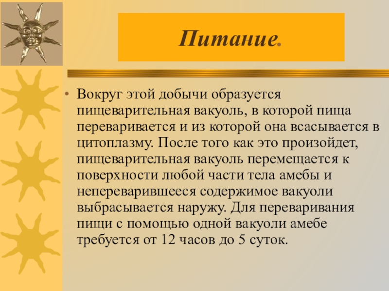 из которой она всасывается в цитоплазму. После того как это произойдет, пищеварительная вакуоль перемещается к поверхности любой части тела амебы и непереварившееся содержимое вакуоли выбрасывается наружу. Для переваривания пищи с помощью одной вакуоли амебе требуется от 12 часов до 5 суток.