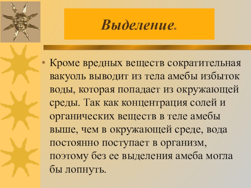 которая попадает из окружающей среды. Так как концентрация солей и органических веществ в теле амебы выше, чем в окружающей среде, вода постоянно поступает в организм, поэтому без ее выделения амеба могла бы лопнуть.