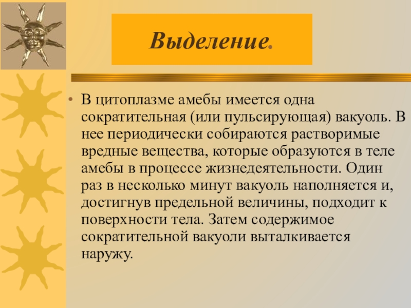 периодически собираются растворимые вредные вещества, которые образуются в теле амебы в процессе жизнедеятельности. Один раз в несколько минут вакуоль наполняется и, достигнув предельной величины, подходит к поверхности тела. Затем содержимое сократительной вакуоли выталкивается наружу.