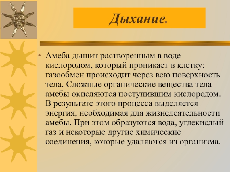 происходит через всю поверхность тела. Сложные органические вещества тела амебы окисляются поступившим кислородом. В результате этого процесса выделяется энергия, необходимая для жизнедеятельности амебы. При этом образуются вода, углекислый газ и некоторые другие химические соединения, которые удаляются из организма.