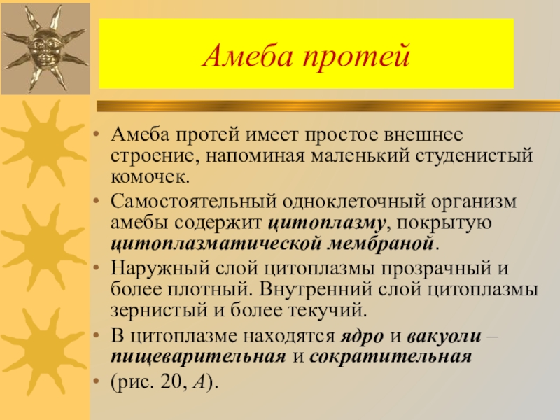 Она обладает раздражимостью – способностью отвечать на воздействие окружающей среды. Амеба протей не имеет постоянной формы тела, так как цитоплазма постоянно образует выпячивания – ложноножки, с помощью которых она передвигается.