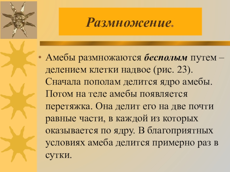 Амебы размножаются бесполым путем – делением клетки надвое (рис. 23). Сначала