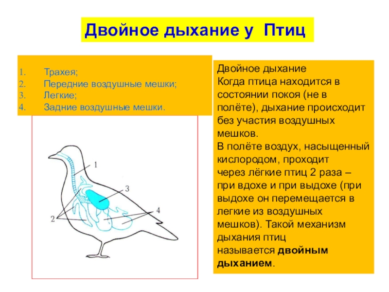 Некоторые бронхи оканчиваются воздушными мешками, заходящими в полости между внутренними органами, в полости костей, между мышцами.