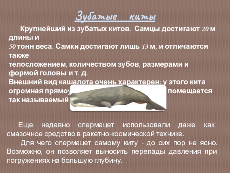 Крупнейший из зубатых китов. Самцы достигают 20 м длины и