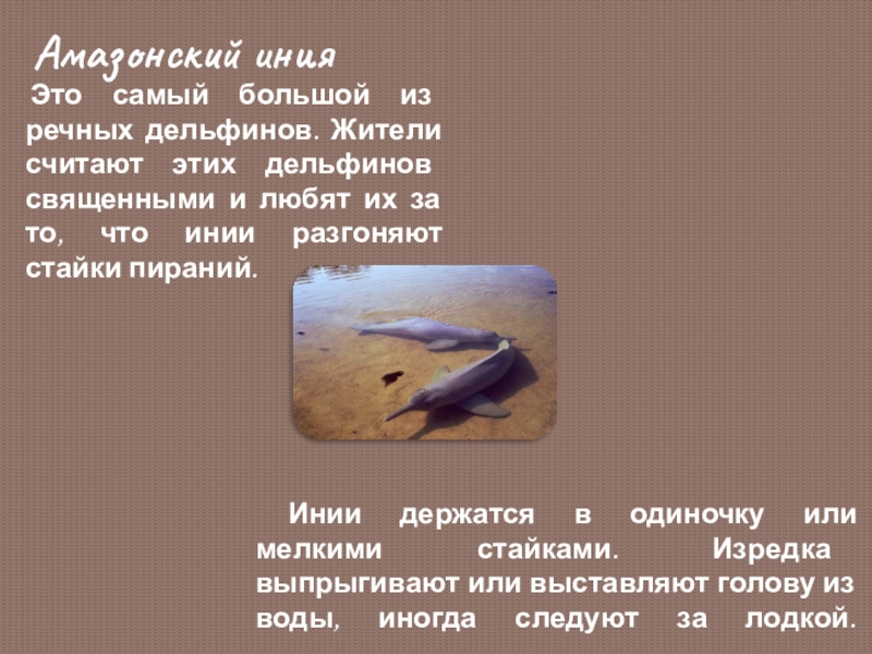 Инии держатся в одиночку или мелкими стайками. Изредка выпрыгивают или выставляют голову из воды, иногда следуют за лодкой.