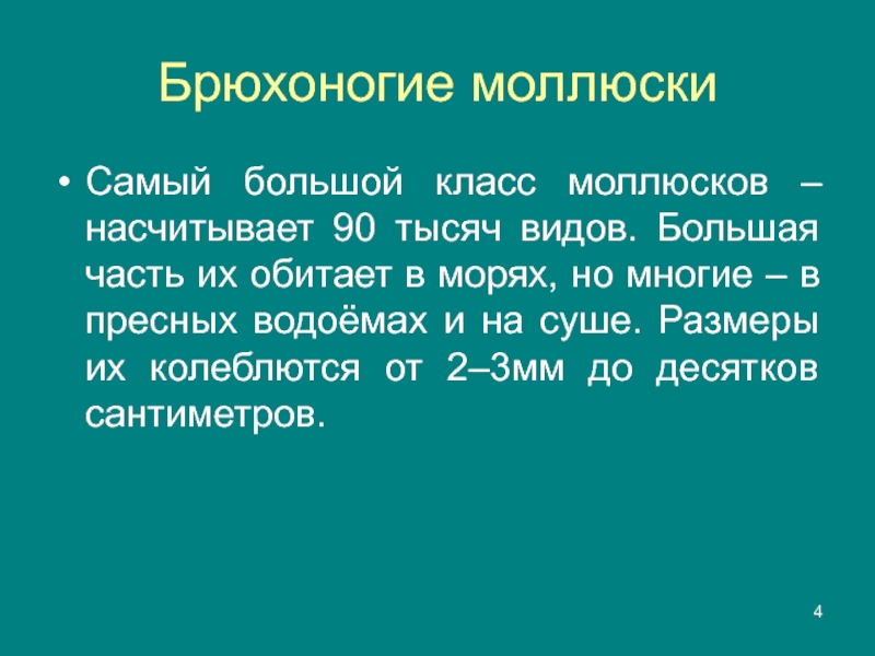 Брюхоногие моллюскиСамый большой класс моллюсков – насчитывает 90 тысяч видов. Большая часть их обитает в морях, но