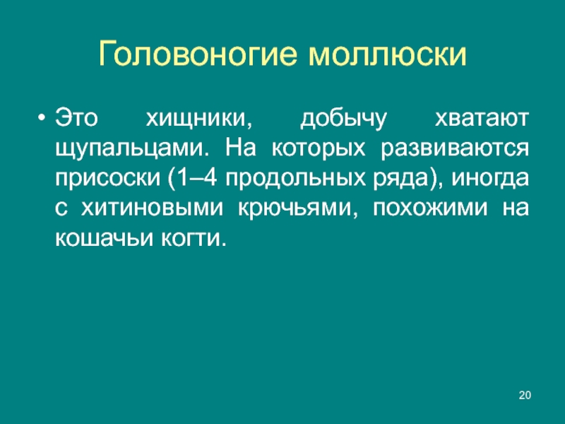 Головоногие моллюскиЭто хищники, добычу хватают щупальцами. На которых развиваются присоски (1–4 продольных ряда), иногда с хитиновыми крючьями,