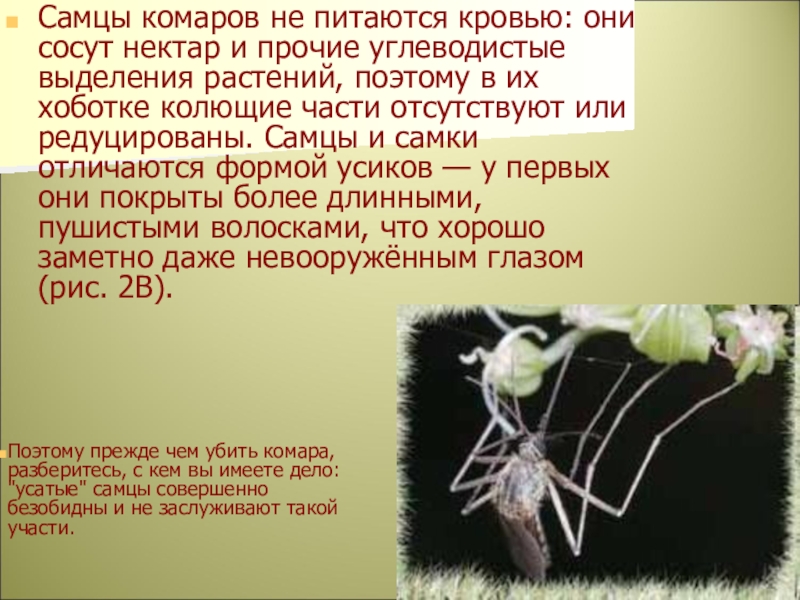 Слайд 12Самцы комаров не питаются кровью: они сосут нектар и прочие углеводистые