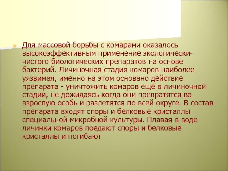 на основе бактерий. Личиночная стадия комаров наиболее уязвимая, именно на этом основано действие препарата - уничтожить комаров ещё в личиночной стадии, не дожидаясь когда они превратятся во взрослую особь и разлетятся по всей округе. В состав препарата входят споры и белковые кристаллы специальной микробной культуры. Плавая в воде личинки комаров поедают споры и белковые кристаллы и погибают