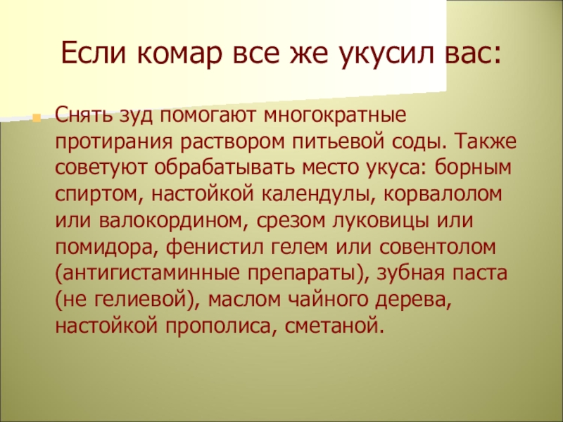 питьевой соды. Также советуют обрабатывать место укуса: борным спиртом, настойкой календулы, корвалолом или валокордином, срезом луковицы или помидора, фенистил гелем или совентолом (антигистаминные препараты), зубная паста (не гелиевой), маслом чайного дерева, настойкой прополиса, сметаной.