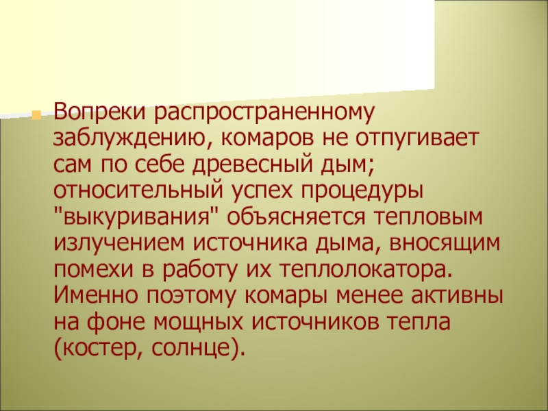 относительный успех процедуры "выкуривания" объясняется тепловым излучением источника дыма, вносящим помехи в работу их теплолокатора. Именно поэтому комары менее активны на фоне мощных источников тепла (костер, солнце).
