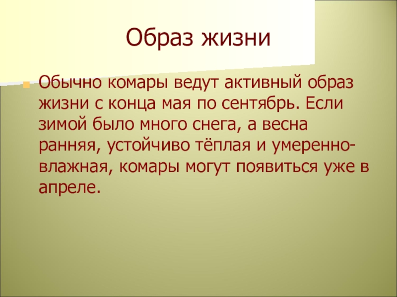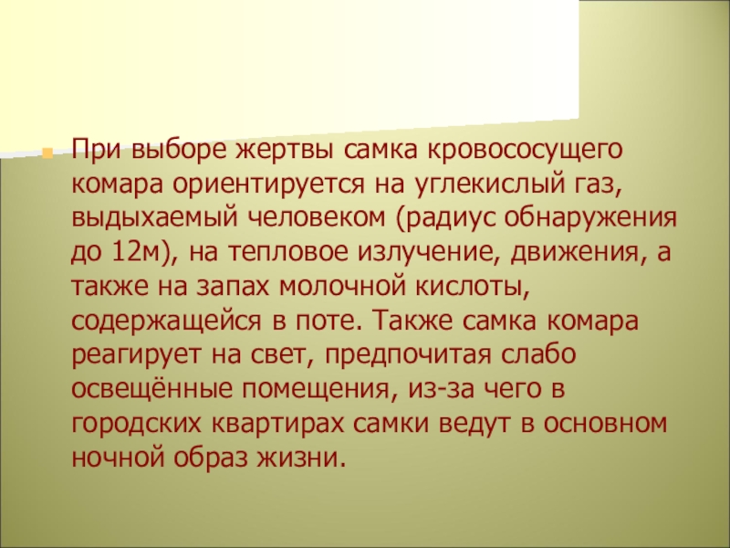 человеком (радиус обнаружения до 12м), на тепловое излучение, движения, а также на запах молочной кислоты, содержащейся в поте. Также самка комара реагирует на свет, предпочитая слабо освещённые помещения, из-за чего в городских квартирах самки ведут в основном ночной образ жизни.