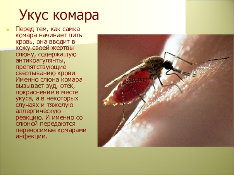 в кожу своей жертвы слюну, содержащую антикоагулянты, препятствующие свертыванию крови. Именно слюна комара вызывает зуд, отёк, покраснение в месте укуса, а в некоторых случаях и тяжелую аллергическую реакцию. И именно со слюной передаются переносимые комарами инфекции.