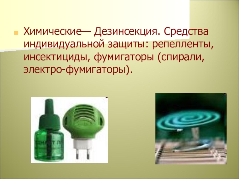 Химические— Дезинсекция. Средства индивидуальной защиты: репелленты, инсектициды, фумигаторы (спирали, электро-фумигаторы).