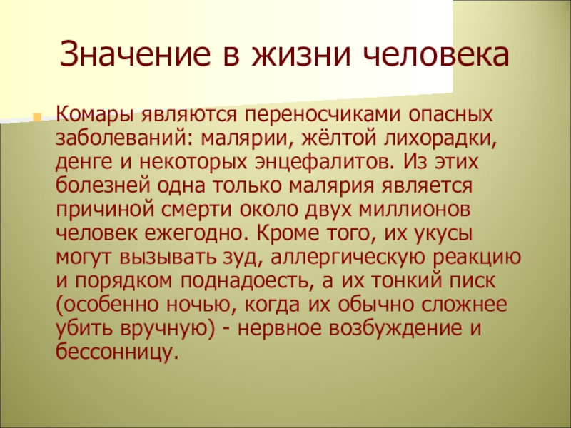 Комары являются переносчиками опасных заболеваний: малярии, жёлтой лихорадки,