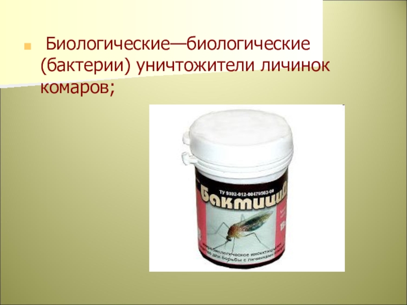 Биологические—биологические (бактерии) уничтожители личинок комаров;