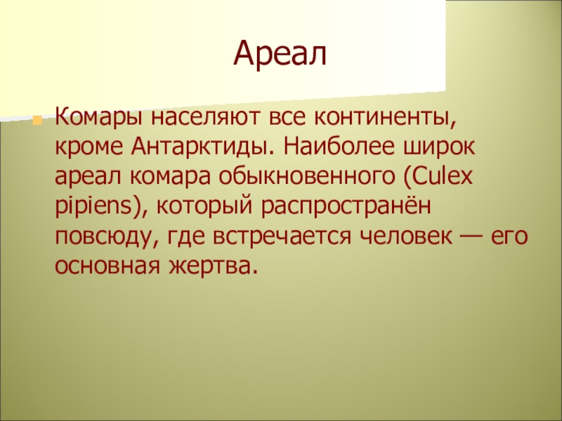 Комары населяют все континенты, кроме Антарктиды. Наиболее широк ареал комара обыкновенного