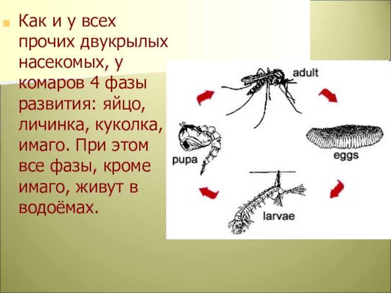 Слайд 16Как и у всех прочих двукрылых насекомых, у комаров 4 фазы