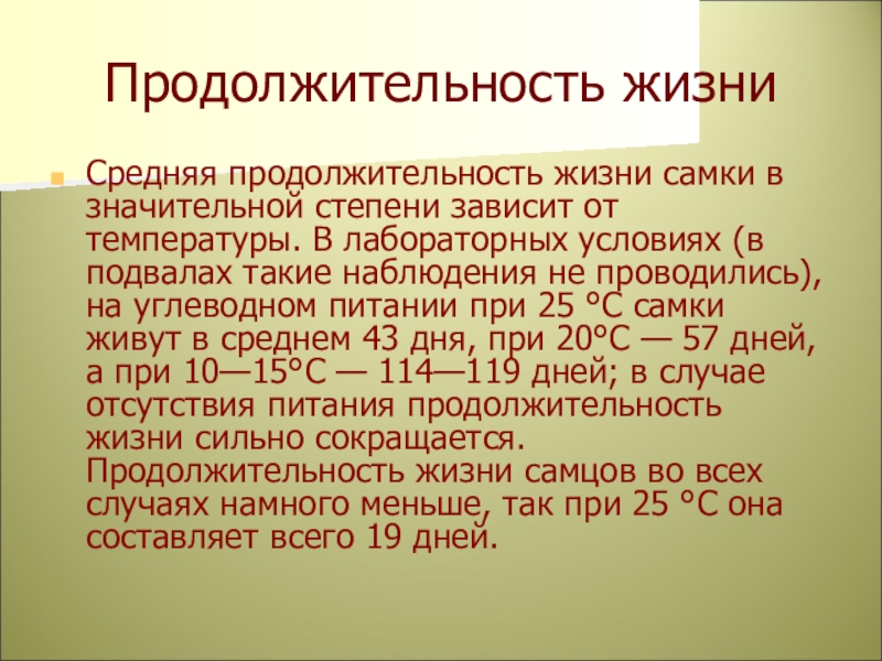Средняя продолжительность жизни самки в значительной степени зависит от температуры.