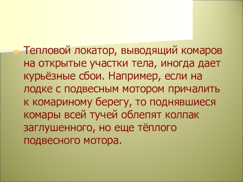 сбои. Например, если на лодке с подвесным мотором причалить к комариному берегу, то поднявшиеся комары всей тучей облепят колпак заглушенного, но еще тёплого подвесного мотора.