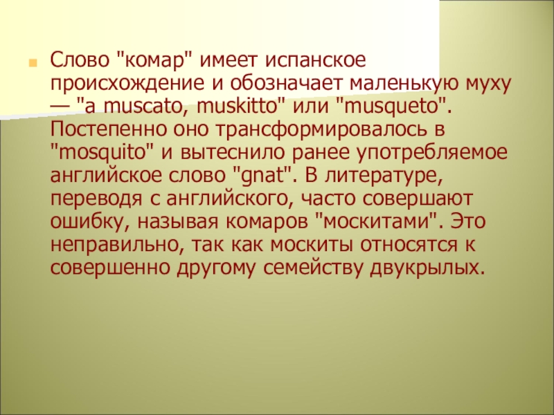 Слайд 3Слово "комар" имеет испанское происхождение и обозначает маленькую муху — "a