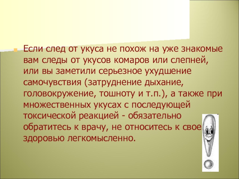 от укусов комаров или слепней, или вы заметили серьезное ухудшение самочувствия (затруднение дыхание, головокружение, тошноту и т.п.), а также при множественных укусах с последующей токсической реакцией - обязательно обратитесь к врачу, не относитесь к своему здоровью легкомысленно.