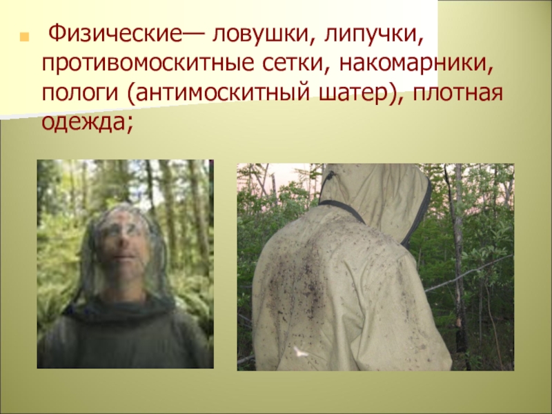 Слайд 29 Физические— ловушки, липучки, противомоскитные сетки, накомарники, пологи (антимоскитный шатер), плотная