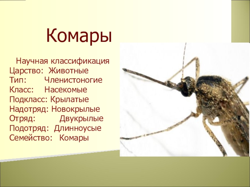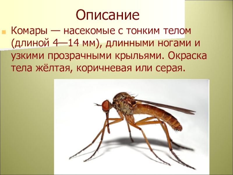 Комары — насекомые с тонким телом (длиной 4—14 мм), длинными ногами