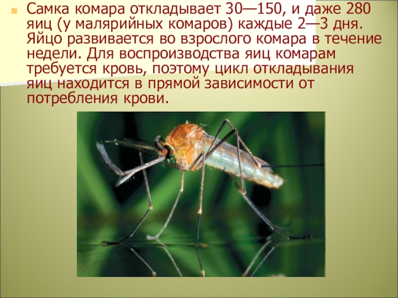 Слайд 15Самка комара откладывает 30—150, и даже 280 яиц (у малярийных комаров)
