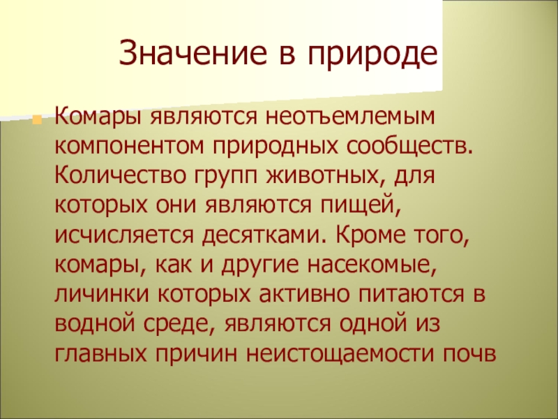 для которых они являются пищей, исчисляется десятками. Кроме того, комары, как и другие насекомые, личинки которых активно питаются в водной среде, являются одной из главных причин неистощаемости почв