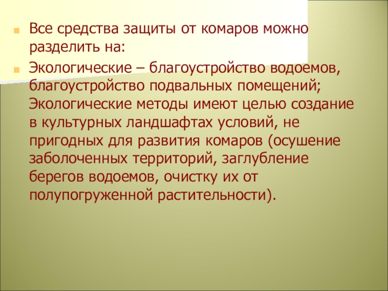 благоустройство подвальных помещений; Экологические методы имеют целью создание в культурных ландшафтах условий, не пригодных для развития комаров (осушение заболоченных территорий, заглубление берегов водоемов, очистку их от полупогруженной растительности).