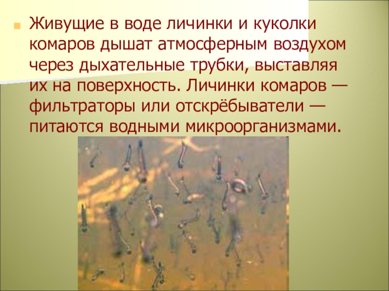 Слайд 18Живущие в воде личинки и куколки комаров дышат атмосферным воздухом через