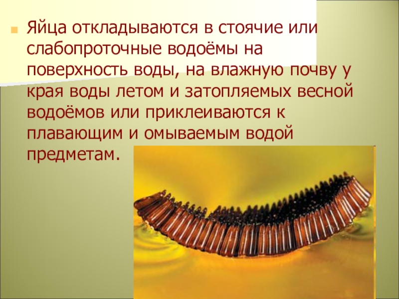 Слайд 17Яйца откладываются в стоячие или слабопроточные водоёмы на поверхность воды, на