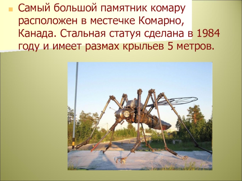 Слайд 25Самый большой памятник комару расположен в местечке Комарно, Канада. Стальная статуя