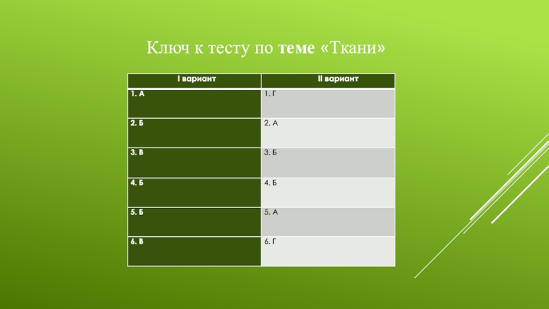 Слайд 2Ключ к тесту по теме «Ткани»