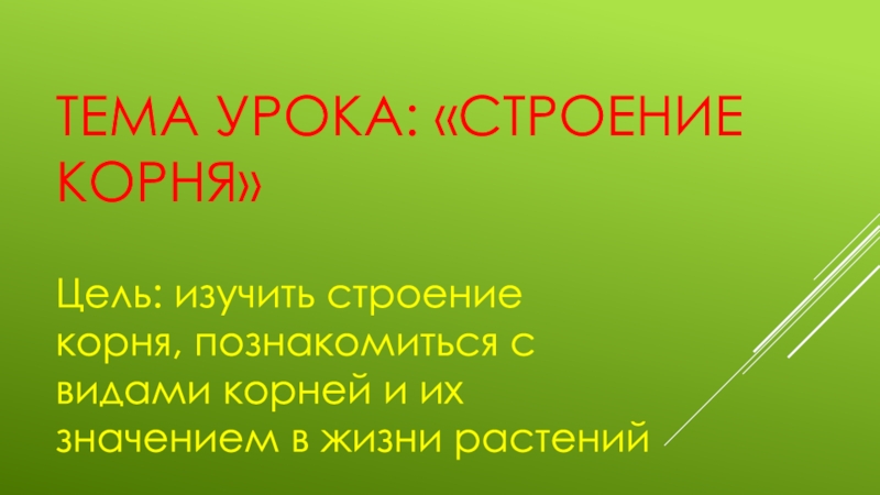 Тема урока: «Строение корня»Цель: изучить строение корня, познакомиться с видами корней и их значением в жизни растений