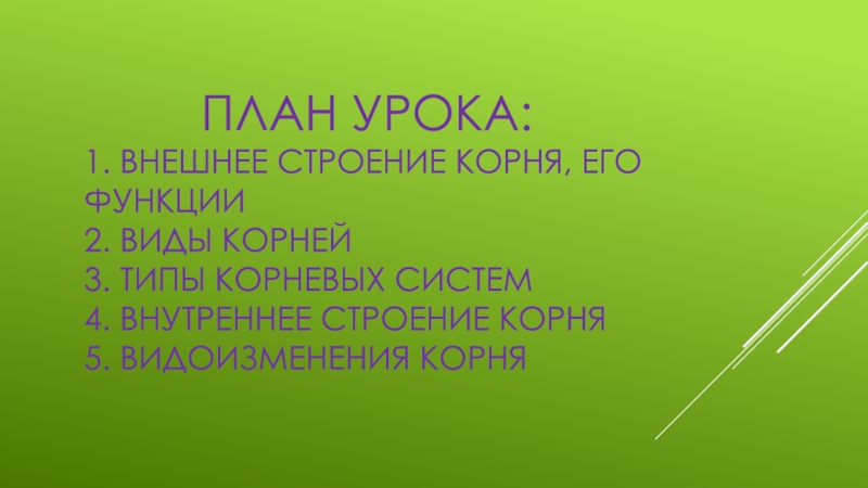 План урока: 1. Внешнее строение корня, его функции 2. Виды