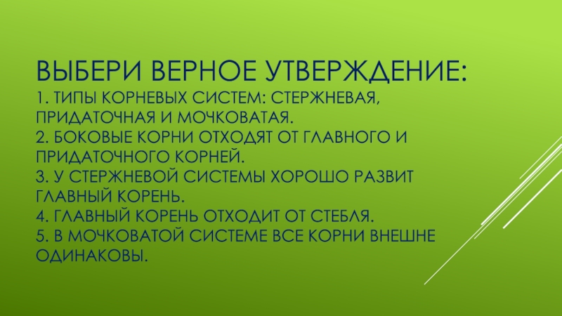 Слайд 9Выбери верное утверждение: 1. Типы корневых систем: стержневая, придаточная и мочковатая. 2. Боковые