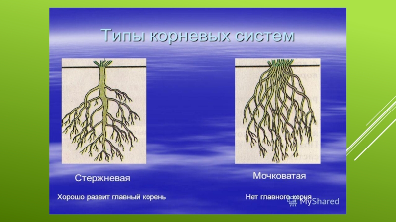 корни отходят от главного и придаточного корней. 3. У стержневой системы хорошо развит главный корень. 4. Главный корень отходит от стебля. 5. В мочковатой системе все корни внешне одинаковы.