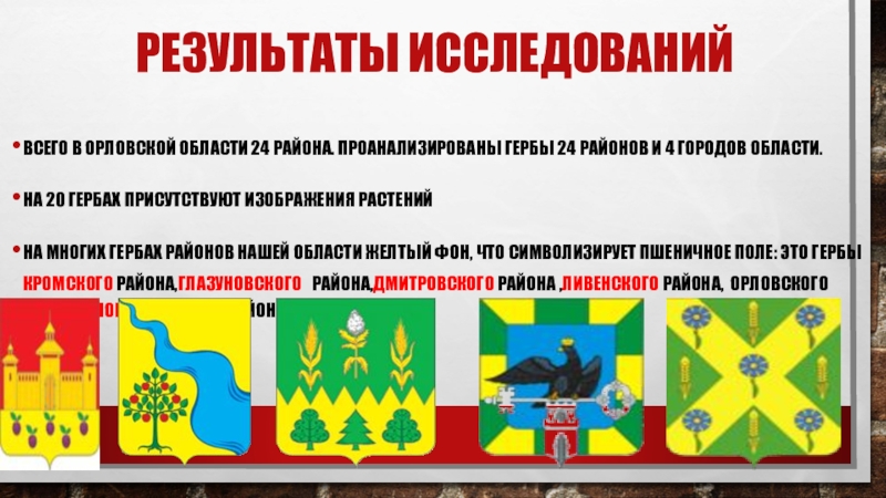 Нами были проанализированы изображения гербов районов и городов орловской области на предмет присутствия на них растений