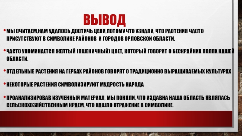 МЫ СЧИТАЕМ,НАМ УДАЛОСЬ ДОСТИЧЬ ЦЕЛИ,ПОТОМУ ЧТО УЗНАЛИ, что растения часто присутствуют в символике районов и городов Орловской области.