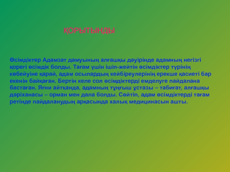 үшін ішіп-жейтін өсімдіктер түрінің көбейуіне қарай, адам осылардың кейбіреулерінің ерекше қасиеті бар екенін байқаған. Бертін келе сол өсімдіктерді емделуге пайдалана бастаған. Яғни айтқанда, адамның тұңғыш ұстазы – табиғат, алғашқы дәріханасы – орман мен дала болды. Сөйтіп, адам өсімдіктерді тағам ретінде пайдаланудың арқасында халық медицинасын ашты.