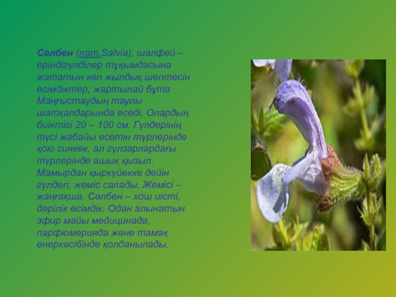 Слайд 11Сәлбен (лат.Salvia), шалфей – еріндігүлділер тұқымдасына жататын көп жылдық шөптесін өсімдіктер,