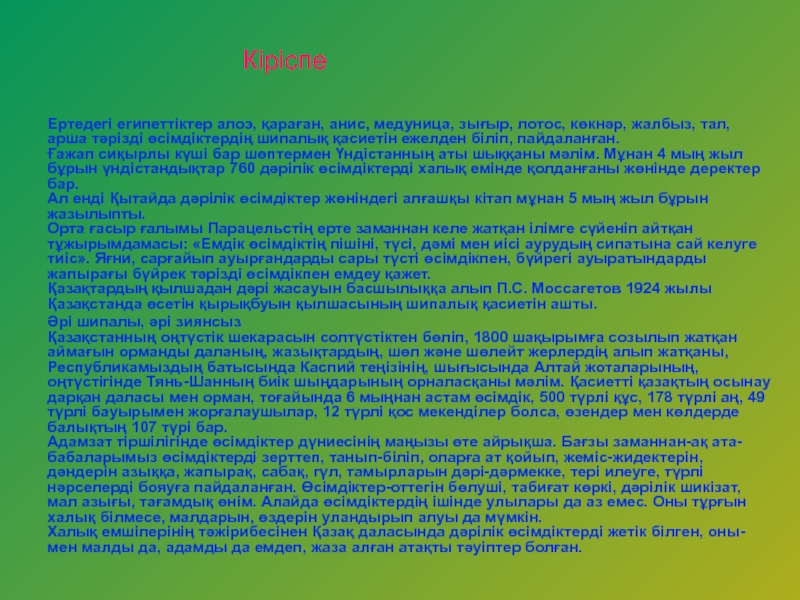 Слайд 4Ертедегі египеттіктерге алоэ, қараған, анис, медуница, зығыр, лотос, көкпар, жалбыз, тал,